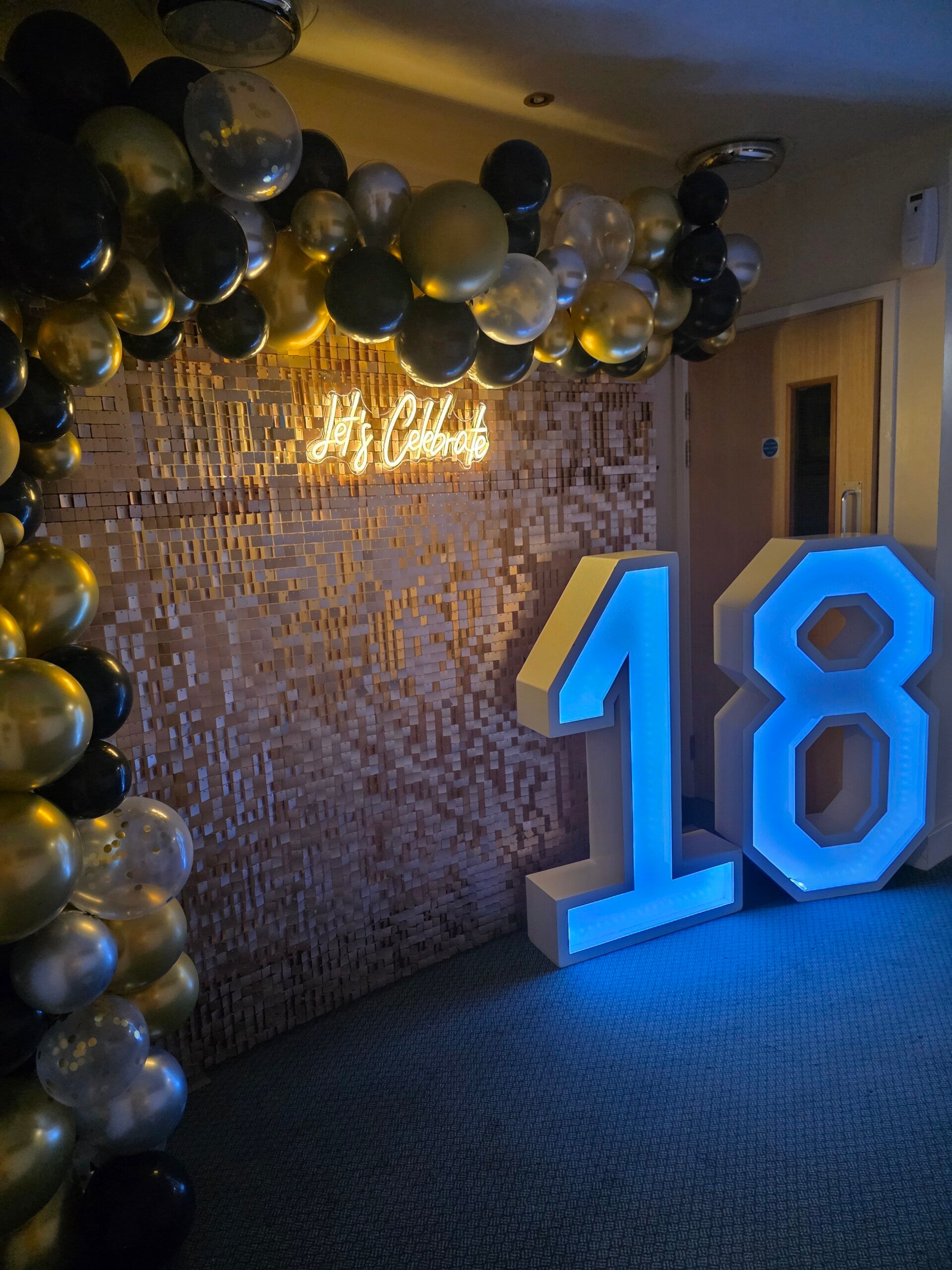 The shimmer wall can also be paired with neon signs, light-up letters or balloon displays to create a customised look that matches your event theme.